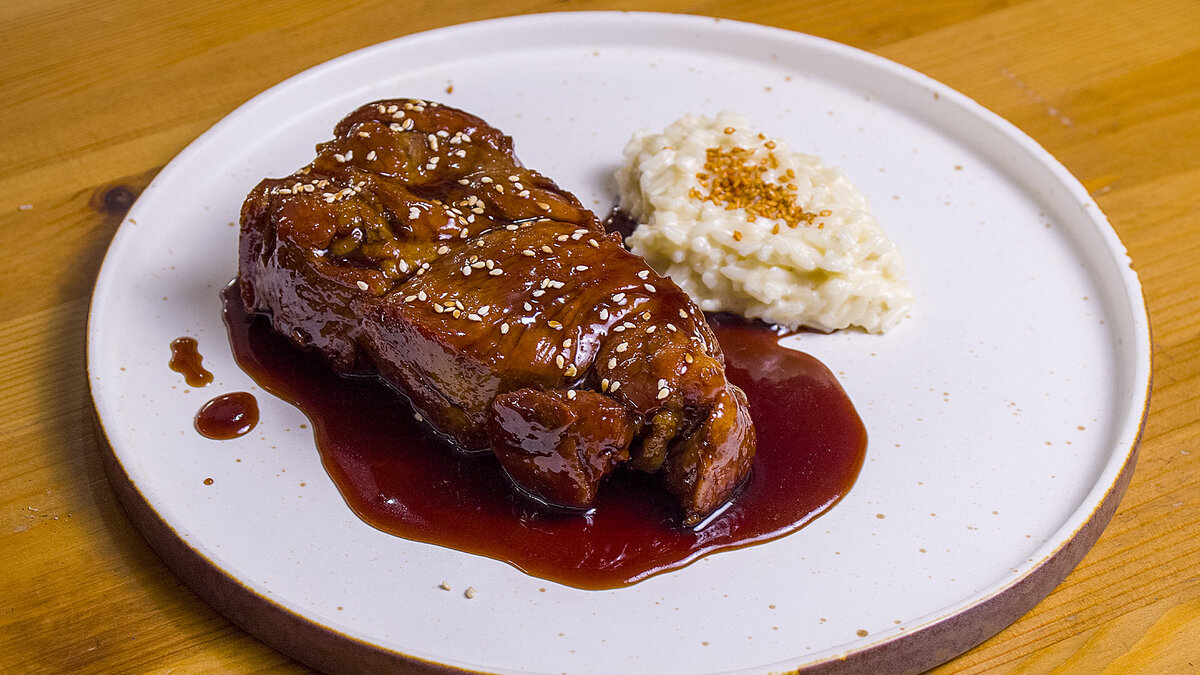 На тарелке разместите ваше аппетитное блюдо — глазированную свинину, рядом положите рис, предварительно заправленный сливками и плавленым сыром. Обязательно посыпьте блюдо кунжутом для ультрамодного завершения! Подавайте на стол и наслаждайтесь этим удивительным кулинарным творением вместе с близкими.