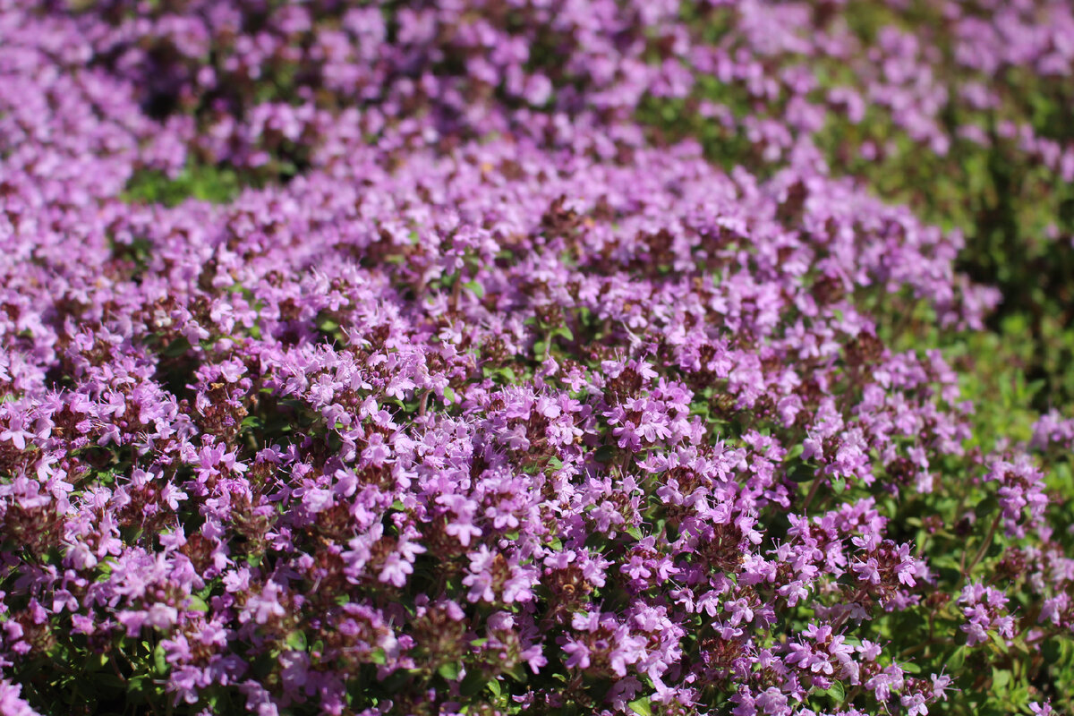 Летом цветение тимьяна впечатляет, хотя в сезоны засухи оно может немного страдать. Однако даже летом с правильно подобранными сортами можно получить прекрасные оттенки цветов.
