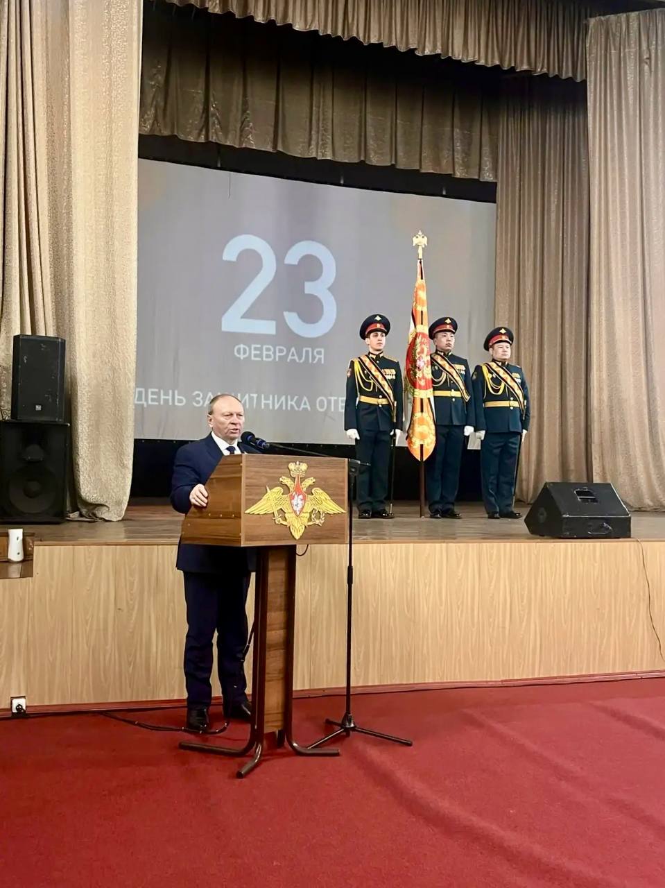 Далее Председатель Народного Хурала Республики Бурятия Владимир Павлов принял участие в торжественном собрании, посвященном празднованию Дня защитника Отечества, прошедшем в клубе 5-й отдельной гвардейской танковой Тацинской Краснознамённой, ордена Суворова бригады в Улан-Удэ.