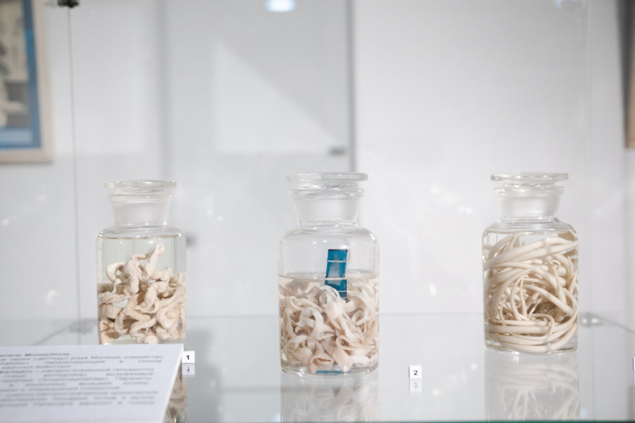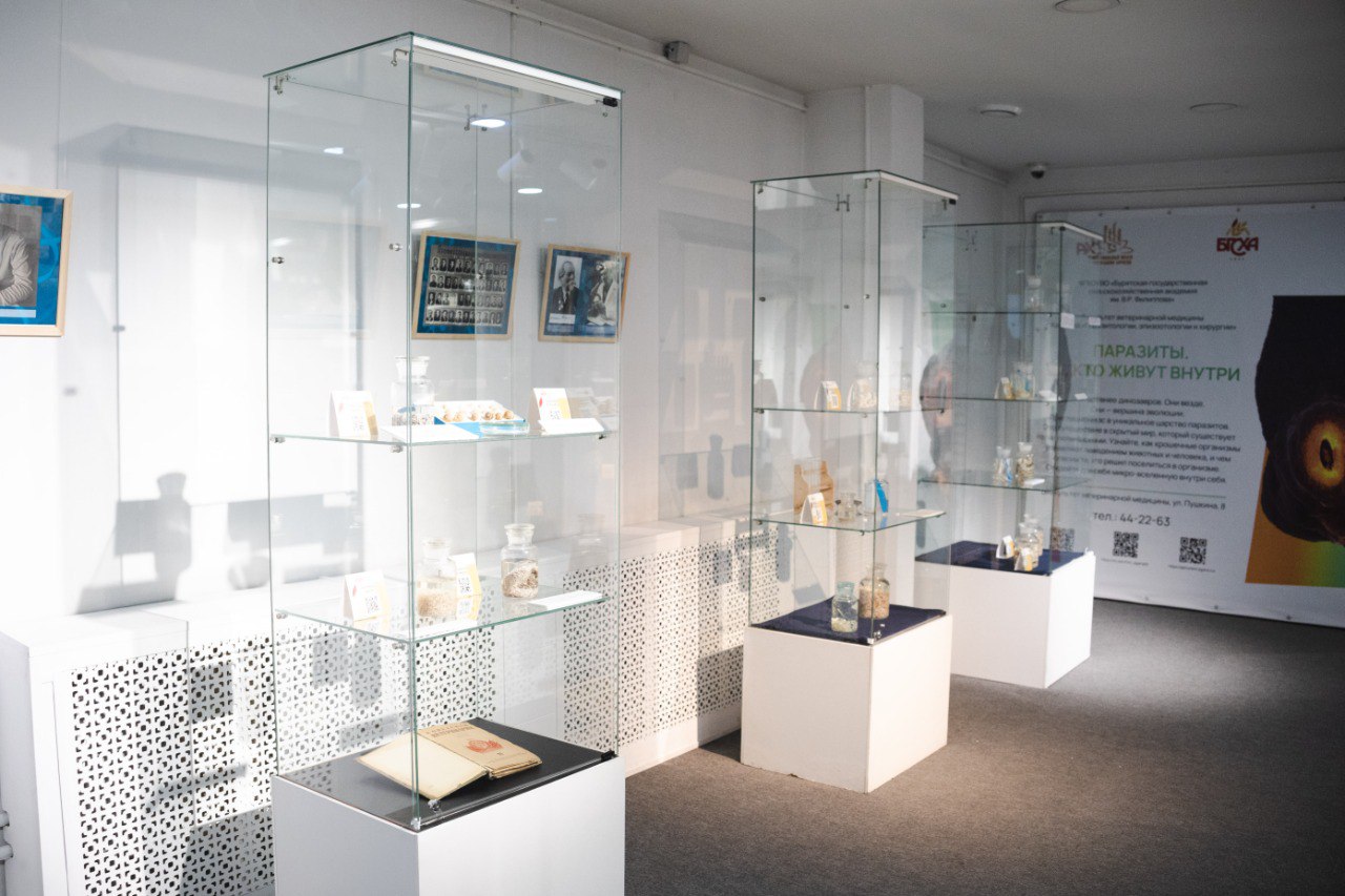 Гостям представили около 60 уникальных экспонатов, собранных и подготовленных студентами-ветеринарами во время обучения. В витринах можно увидеть представителей мира паразитов — от микроскопических клещей до редких и наглядных препаратов, в том числе шкуру косули, поражённую подкожным оводом, сердце волка и даже голову барсука. Экспозиция показывает, насколько разнообразен и порой незаметен для человека этот мир.