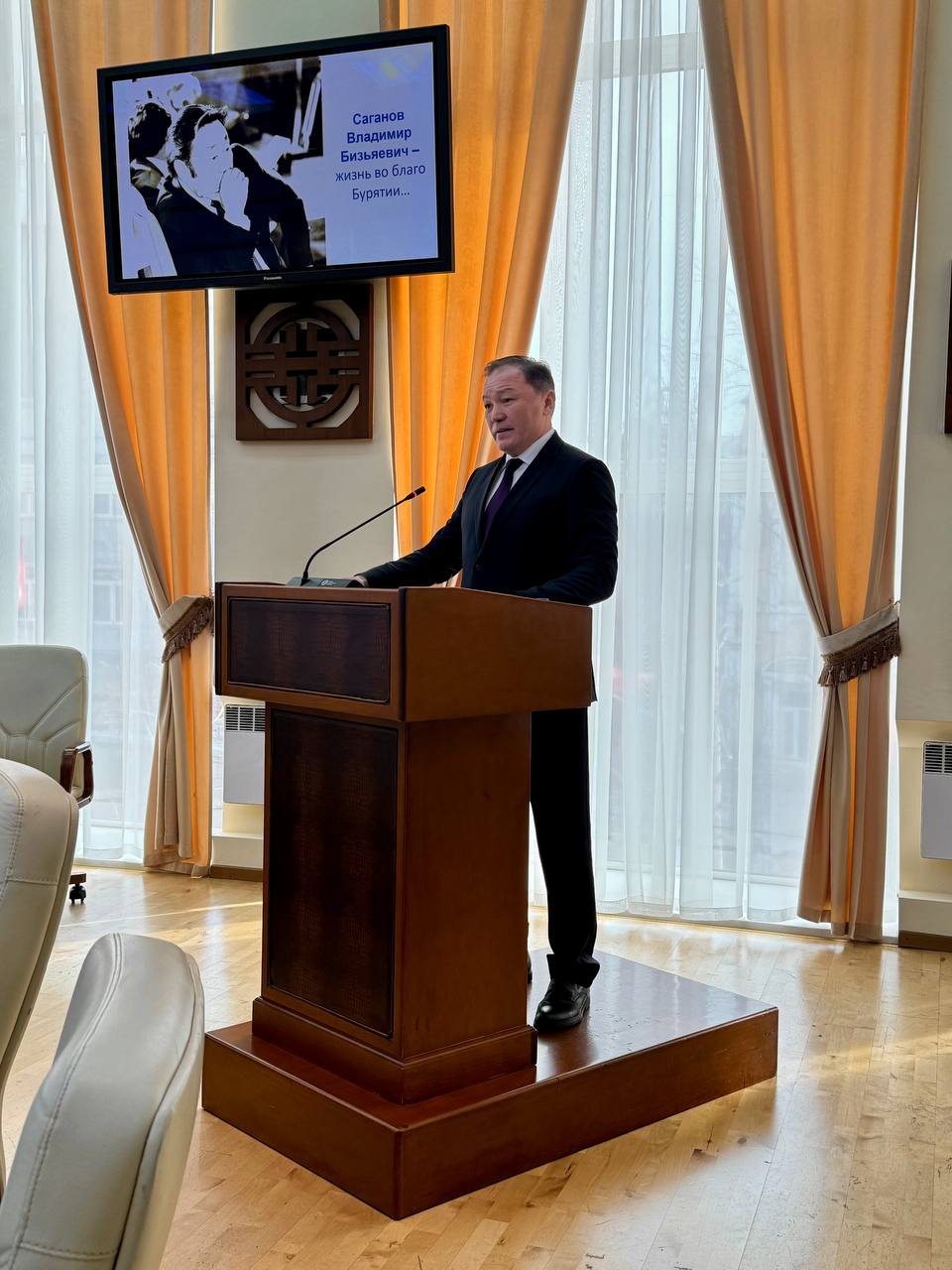 В своем приветственном слове на бурятском и русском языках спикер отметил уникальность личности Владимира Саганова, чья судьба стала отражением целой эпохи в жизни республики: «Он был сильным руководителем, посвятившим свою жизнь служению народу. Его компетентность, государственный подход к делу, принципиальность и одновременно человечность знали многие. Его жизнь – это отличный пример того, как надо работать ради благополучия народа», – подчеркнул в своем выступлении Владимир Анатольевич.