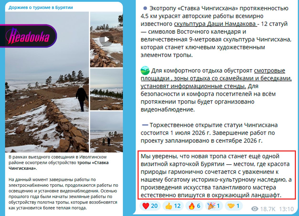 Неподалеку от Улан-Удэ обустраивают экотропу «Ставка Чингисхана» — это туристический маршрут протяженностью 4,5 км. Его украсят 12 статуй-символов Восточного календаря, а «ключевым» элементом декора станет 9-метровая скульптура хана Монгольской империи, написал министр туризма Бурятии Алдар Доржиев в соцсетях. По его словам, «торжественное открытие» статуи состоится 1 июля. Однако установка такого памятника возмутила общественников.
