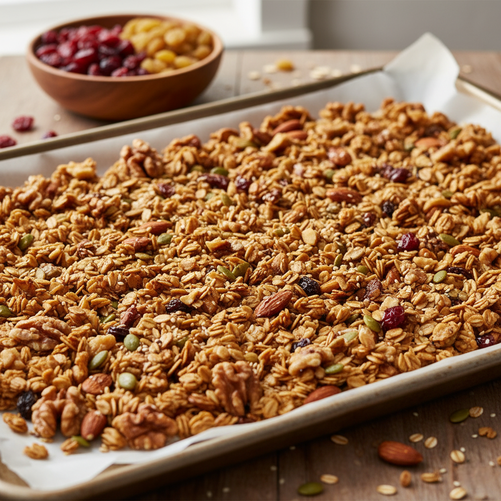 - Охлаждение и финал: Дайте граноле полностью остыть на противне — она станет хрустящей. После остывания добавьте сухофрукты и пересыпьте в герметичный контейнер, где она может храниться до месяца.