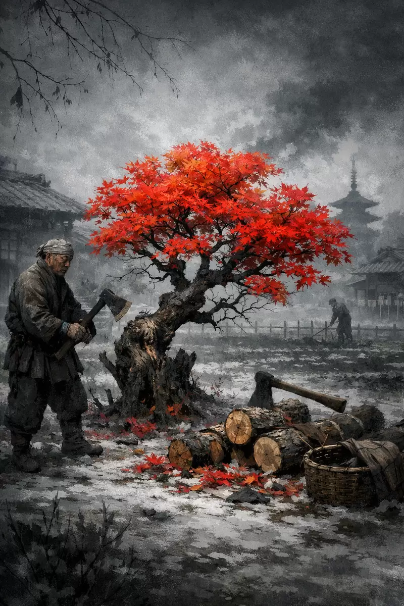 Зимой 1944 года в пригороде Осаки садовник с топором подошёл к древнему клёну, который долгое время был частью его семьи. Это дерево, увенчанное уникальными листьями, которое уже не могло похвалиться своей былой красотой, стало жертвой времени и сложных условий. В условиях нехватки ресурсов и политической нестабильности необходимо было подумать о выживании – древесина клёна пошла на дрова, чтобы отапливать дома.