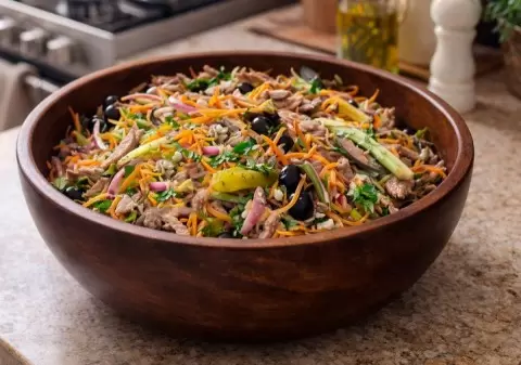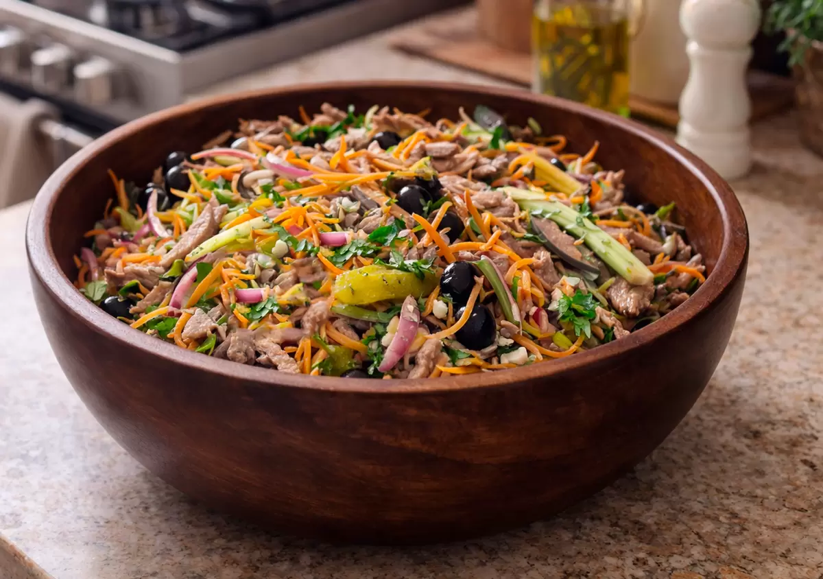 Этот салат будет ярким акцентом вашего стола, объединяя хрустящие овощи и сочную говядину.