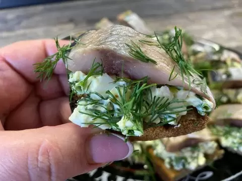 На каждый кусочек хлеба аккуратно нанести приготовленную яично-луковую массу, а сверху выложить нарезанные кусочками филе селедки. В завершение можно украсить готовую закуску свежими зелеными веточками. Закуска готова к подаче!