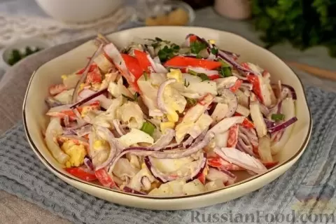 - Салат с крабовыми палочками и кальмарами – легкое, но сытное лакомство, которое можно легко приготовить за считанные минуты.