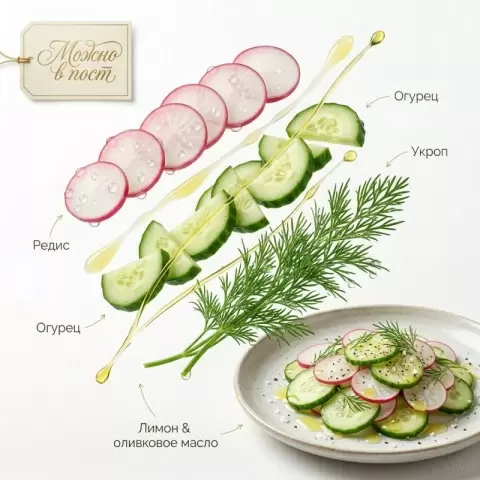 Начнём с этого салата, который словно дышит свежестью. Хрустящий редис, сочный огурец и душистый укроп создают яркое весеннее настроение. В редисе — невероятное количество витамина C, что делает его идеальным стартом для любого обеда.