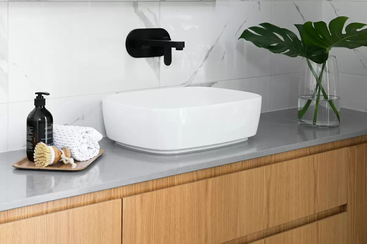 - Столешницы под накладные и встраиваемые раковины: обеспечивают возможность выбрать разные размеры и легко монтируются, что делает их идеальными для большинства ванных комнат.