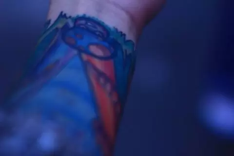 Идея создать татуировку в виде силуэта человечка в капюшоне была лишь началом. Этот эскиз, выполненный с помощью черного контура, вскоре обрел жизнь в окружении ярких грибов. Постепенно возникли новые образы, и одним из них стал синий мухомор с «зомби» тематикой на запястье. Но это лишь толика того, что последовало дальше.
