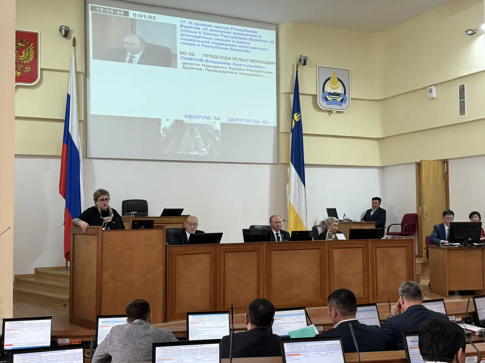 На сессии с докладом выступила министр социальной защиты населения республики Татьяна Быкова, содоклад представил председатель Комитета Народного Хурала по социальной политике Игорь Марковец.
