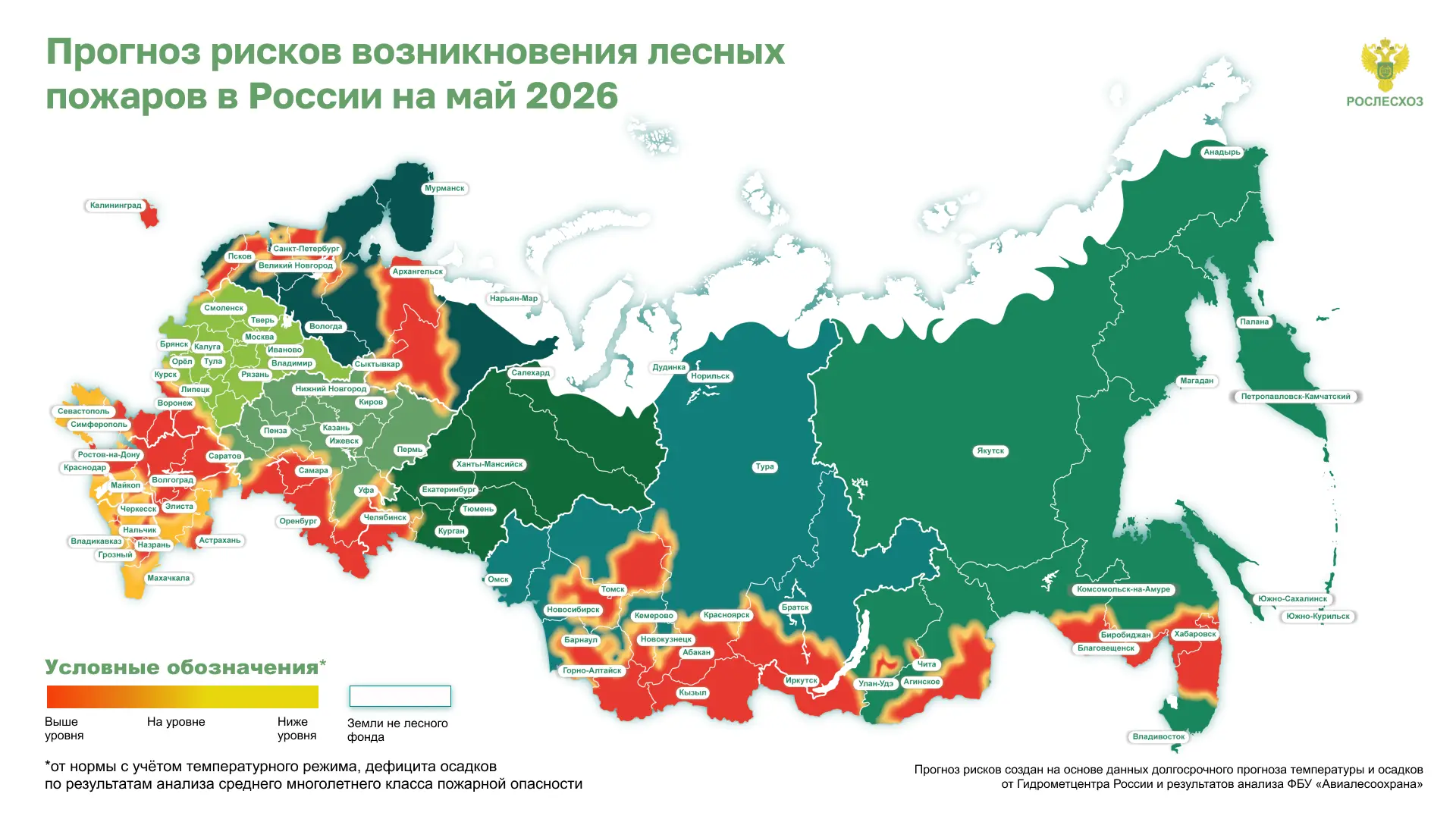 ФБУ «Авиалесоохрана», подведомственная организация Рослесхоза, разработала предварительный прогноз рисков возникновения пожарной опасности в лесах России на май 2026 года.
