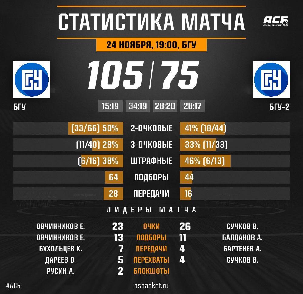 Первая игра чемпионата студенческого баскетбола 2025–2026 между командами БГУ и БГУ-2 завершилась со счетом 105:75 в пользу БГУ.